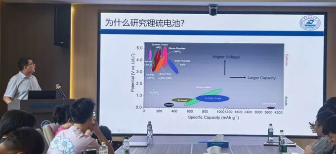 在本次报告中,伽龙教授就“基于弱溶剂化电解液的锂硫电池”进行了学术报告。伽龙教授指出,锂硫电池的理论能量密度非常高,其研究与开发对于电池安全与储能技术的发展具有重要的意义。教授首先介绍了锂硫电池的反应机理,并对锂硫电池在醚类电解液下的失效原因和商业化应用可能存在的问题进行分析。研究团队聚焦使用弱溶剂化电解液来降低电解液用量、匹配高载量以及高压实硫电极的制备等研究,探究其深层的反应新机制和优化策略。教授还解释了基于弱溶剂化电解液锂硫电池的电化学活化策略和各种稳定电极材料的性能研究方法,并对超高比能锂硫电池进行了实用化探究。最后,伽龙教授总结指出,目前的研究工作已基本解决很多问题,但又带来了低温性能差、金属锂负极问题等新挑战,关于锂硫电池的研究工作仍将继续。