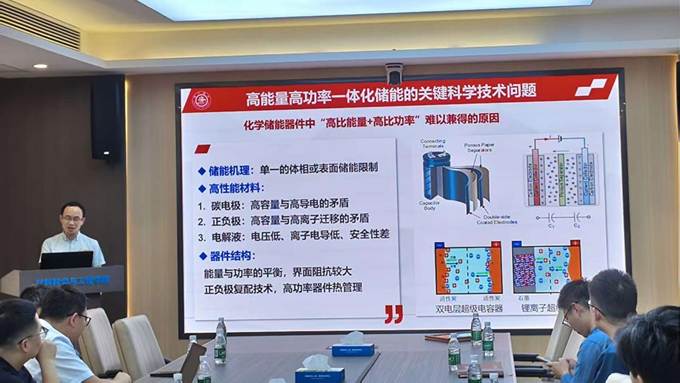 受材料学院周江教授邀请,林天全教授就“高能量高功率一体化储能材料与器件”进行了学术报告。林天全教授指出,当前以电磁弹射、智能电网为代表的新一代高端装备,对电化学储能器件提出了高能量、高功率、高安全、长寿命(简称“三高一长”)的严苛要求,而现有以锂电池和超级电容器为核心的两大类化学储能器件,因自身储能机理的局限性,始终难以同时满足这一关键需求,成为制约高端装备发展的重要瓶颈。