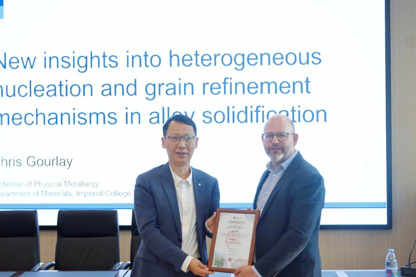 在讲座开始前,李志明副院长进行简单开场白,对到场的国外学者表示欢迎。在本次报告中,Christopher Gourlay 教授就“New insights into heterogeneous nucleation and grain refinement mechanisms in alloy solidification”方面进行了介绍。Christopher Gourlay教授指出在许多凝固工艺路线中,控制成核仍然是一大难题。例如电子焊点通常随机成核,导致每个接头的显微组织变化,并且只有在某些合金系统中才有可能生产具有细晶粒尺寸的铸件。Christopher Gourlay教授首先介绍了铸件中理想的微观结构等轴晶、细晶粒铸件的好处,比如可以减少孔隙率以及晶粒细化的要求等。随后从四个部分:1)非均匀形核案例研究:镁的碳接种;2)成核粒子的新方法研究:Al3Ti在TiB2上成核;3)控制电子焊点(锡合金)的成核;4)添加铱对粉红金晶粒细化的影响分别讲述了识别成核取向关系(ORs)的实验方法。将它们与其他凝固取向关系区分开来,为杂质相和亚稳态在成核和晶粒细化中的共同作用提供证据,并根据这些新结果讨论新的机制。讲座以金、镁和锡合金的凝固和金属间化合物的成核为例进行说明。