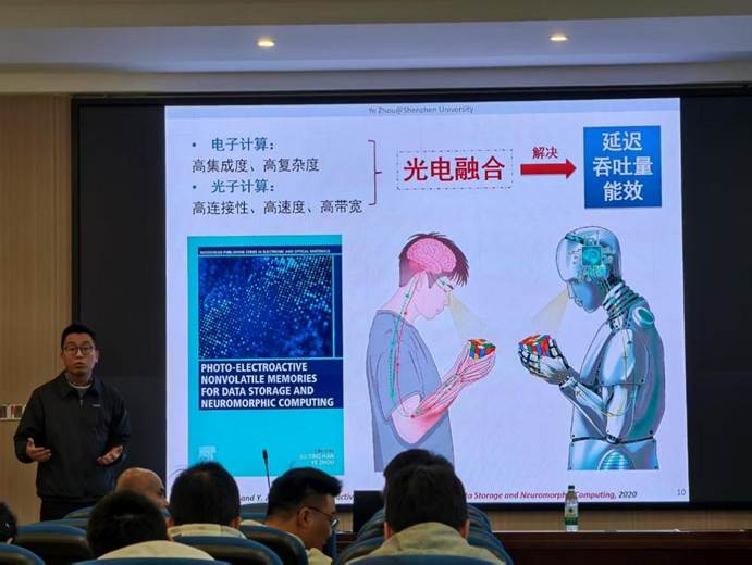 在本次报告中,周晔教授就“光电神经形态器件”方面进行了介绍。他首先介绍了类脑智能,通过模仿人脑的结构、功能和工作机制,用于感知计算存储一体架构。指出人工神经形态(类脑)器件相较于传统计算架构的优势在于处理直觉信息和非结构信息方面,并且介绍了人工突触,其分层级联结构可以重现生物神经系统过程。提出器件是基础,集成是核心,并且提到了信息材料与器件的挑战:尺寸、集成度、算力和功耗,可以将电子计算的高集成度和高复杂度与光子计算的高连接性、高速度和高带宽进行光电融合来解决延迟、吞吐量和能效。重点阐述了晶体管/忆阻器的类型以及特点等,如光控电导态晶体管/忆阻器、光控逻辑运算的忆阻器,晶体管可实现光控突触、多波段传感与存储、光控长短时程可塑、追踪轨迹以及阅后即焚等。最后介绍了两种可能的性能提升路径:(1)量子点+薄膜:提升响应度:(2)多孔形貌薄膜:提升敏感度。