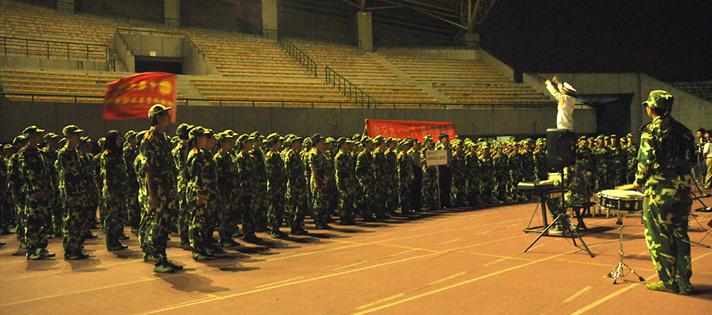 适逢九·一八纪念日,新生们的爱国热情高涨,在合唱结尾高举 “勿忘九·一八,振兴我中华”的横幅。秋风飒飒,吹起了院旗,扬起了执着的脸庞,闪烁的眼睛坚定地注视着前方。前进,前进,向前进!挺起胸膛,何惧风浪。前进,前进,向前进!肩负民族希望!