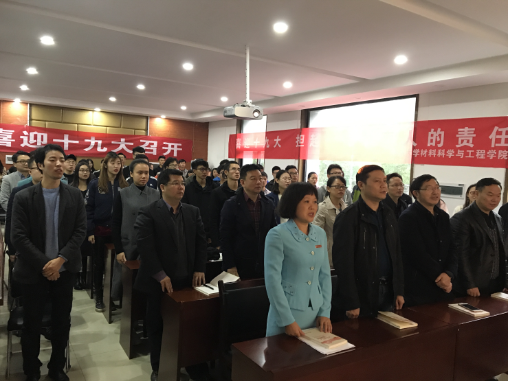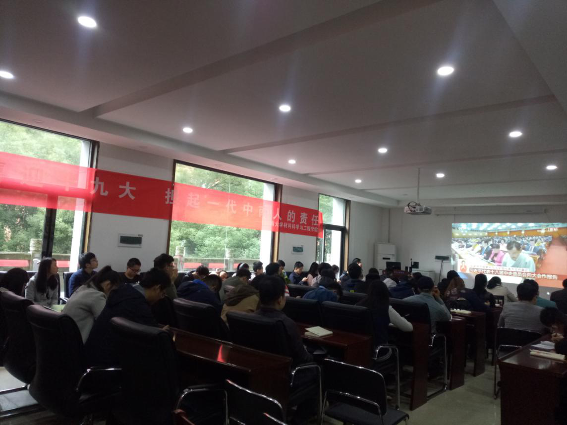 10月18日上午,材料学院认真组织学院师生观看十九大开幕式直播。材料学院党委书记王德志、院长梁叔全、党委副书记胡小清,副院长刘立斌、李周、徐国富、陈志永、冯艳、学工办全体老师以及优秀学生代表出席此次活动。