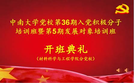 4月14日下午14:00,中南大学党校第36期入党积极分子培训班暨第5期发展对象培训班开班典礼在校本部科教南楼501顺利举行。材料学院党委书记、分党校校长王德志、党委组织干事赵艳、分党校班导师张桐、研究生党支部书记代表马家冀、林建德、李金铭、谭騛出席开班典礼。材料学院全体入党积极分子、发展对象参加此次开班典礼,典礼由张桐老师主持。