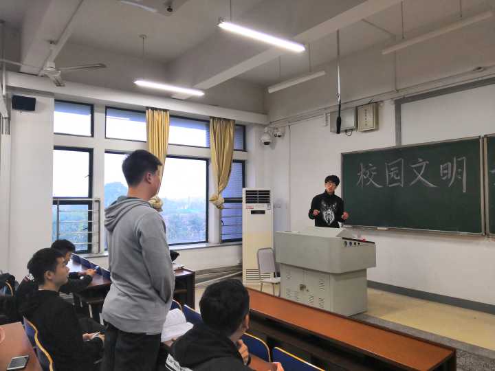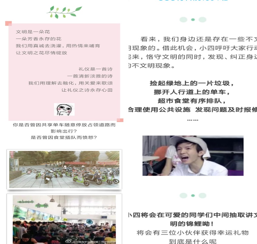 本次活动分为现场讲解与网络宣传两个方面。在现场讲解中,团支书林旭向我们阐述了校园文明与校园生活的紧密联系,小到自行车的停放,大到公共浴室等公共设施的文明使用,都体现着校园文明。他还鼓励同学们说出身边的不文明现象,做到见贤思齐焉,见不贤而内自省也。在网络宣传方面,我们用微信推送的方式号召大家关注校园文明,参与建设校园文明,同学们都积极参与,响应号召。