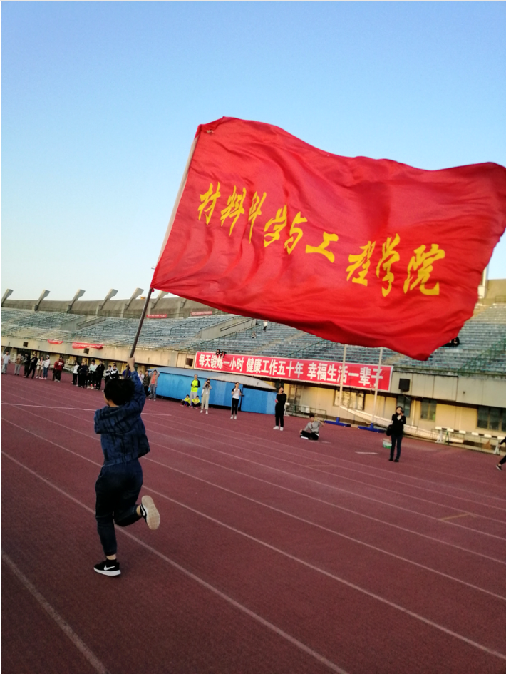 跳绳比赛结束后,由四十个材料学子组成的齿轮转队开始在队长的口令下组织队形,一个接一个的相互支撑。在这个比赛中,他们要靠的不是自己,而是和前后同学的合作。一个齿轮将材料学子紧密联系在一起,他们相互鼓励,共同前进,零失误的操作让他们取得了26秒的优秀成绩。袋鼠跳接力比赛紧接着开始了,交换袋子时的默契,冲向终点的坚定目光,都让我们见证了材子们的焕发精神和勇往直前。尽管布袋束缚了他们的双腿,但这并不是速度的阻碍,因为他们已经与布袋融为一体了。我材飞扬,谁与争锋,小组第一的成绩为你们喝彩!最令人激动的院旗接力比赛在飘扬的“材料科学与工程学院”的红旗中进行着,材料学子斗志昂扬,奋勇向前,直达终点。红旗冉冉,我心澎湃,蓝蓝的天空是你的背景,意气风发的材子高举着你,飘扬吧,我们的院旗,你是材子奔跑的动力,是我们引以为傲的骄傲!