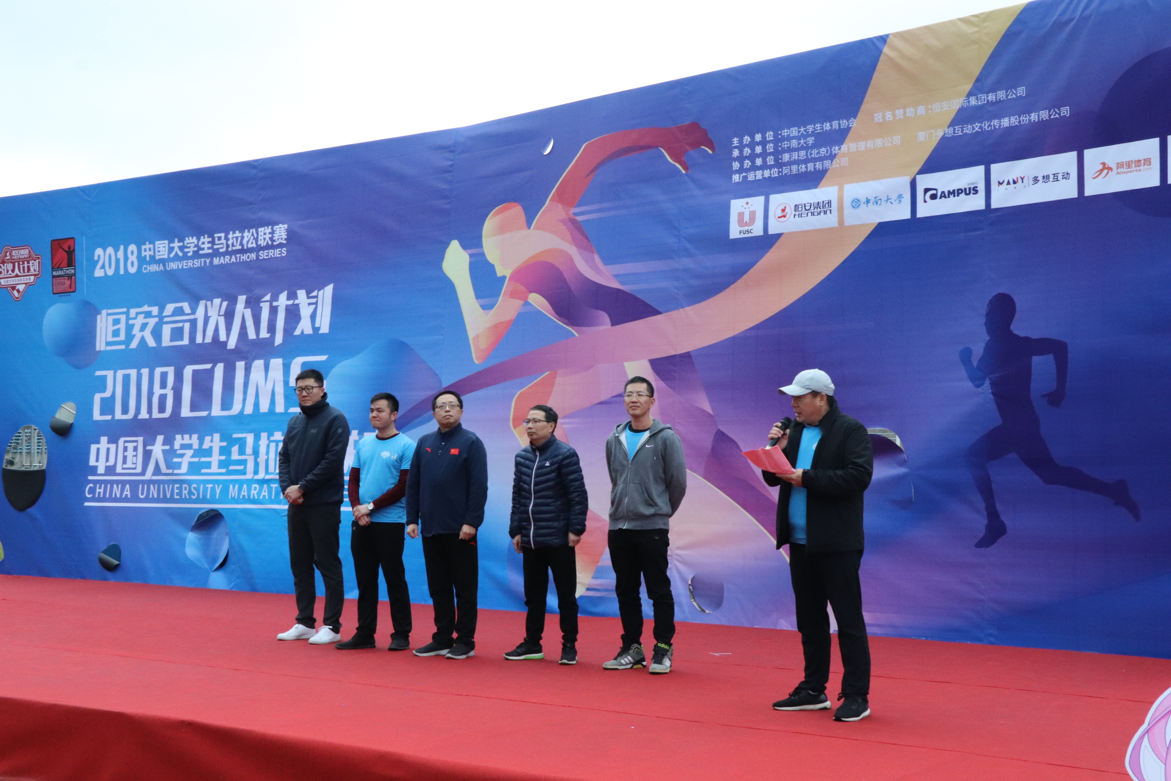 11月18日上午,为丰富校园生活,倡导大学生积极参与体育锻炼,中国大学生马拉松联赛中南大学站于中南大学新校区举行。副校长兼校体育运动委员会主任陈翔教授、体育教研部部长喻跃龙教授、体育教研部党总支书记石共文教授、恒安集团审计部总经理朱建水、恒安集团代表洪游远、文松山、康湃思(北京)体育管理有限公司代表徐辉来到现场,为所有比赛选手加油助威。