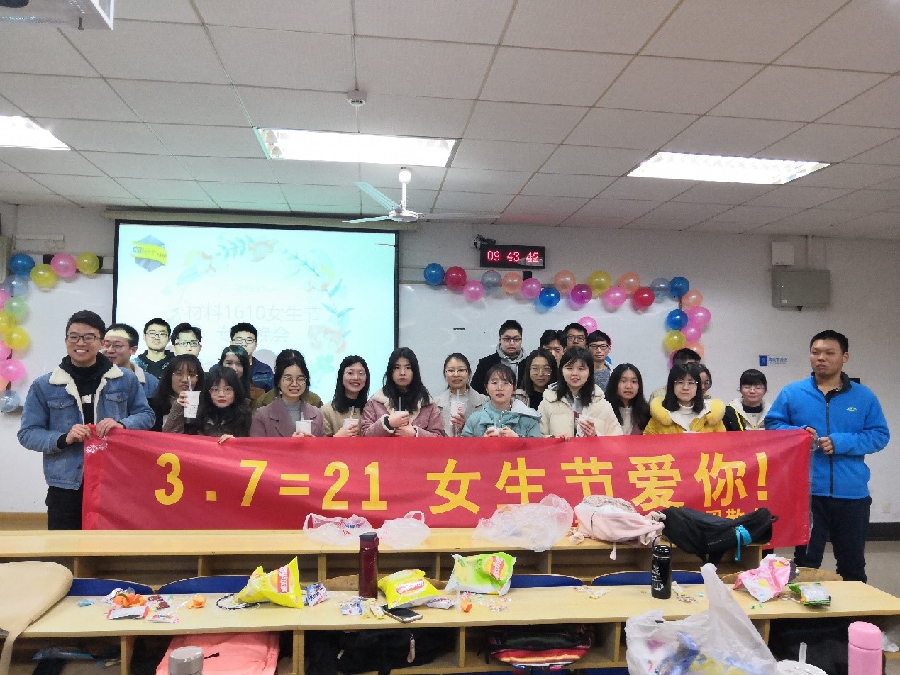 阳春三月,人面桃花相映红;春风扑面,女生节日展风采。为了庆祝女生节的到来,丰富班级校园文化生活,用昂扬向上的精神风貌迎接新学期的到来,3月7日,材料1610班全体同学以“3.7=21,女生节爱你”为主题在科教南楼404举办女生节特别活动。活动由班长徐念澳主持,班导师汪冰峰受邀参与活动。