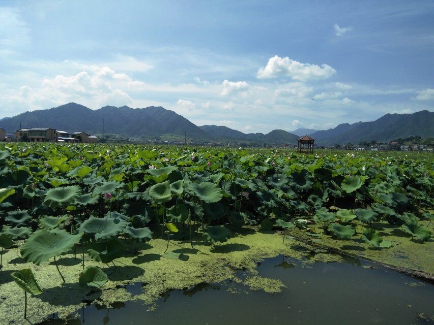 图为黄材镇荷花池和村民的农作物