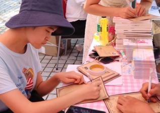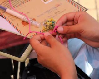 信封由手工制作。同学们发挥自己的创意,展现自己的动手能力,利用现场的花朵,线绳,彩笔,印章等物品装饰信封和信纸,挑选心仪的邮票粘贴于信封上,使信纸信封更加温暖而富有个人特色。