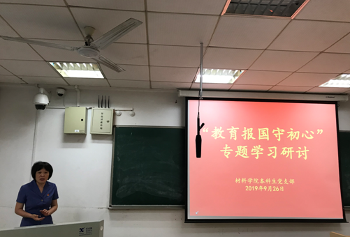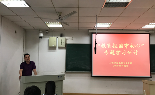 9月26日下午,中南大学材料学院本科生党支部“教育报国守初心”专题学习研讨会于科教北楼106顺利进行。出席本次研讨会的领导老师有学校主题教育指导组第二组组长、党委党校常务副校长兼组织部副部长赵永正,中南大学材料科学与工程学院党委副书记胡小清,中南大学材料科学与工程学院本科生第一党支部书记张西,中南大学材料科学与工程学院本科生第二党支部书记张桐,中南大学材料科学与工程学院本科生第三党支部书记彭需发,本次研讨会由张桐老师进行主持。