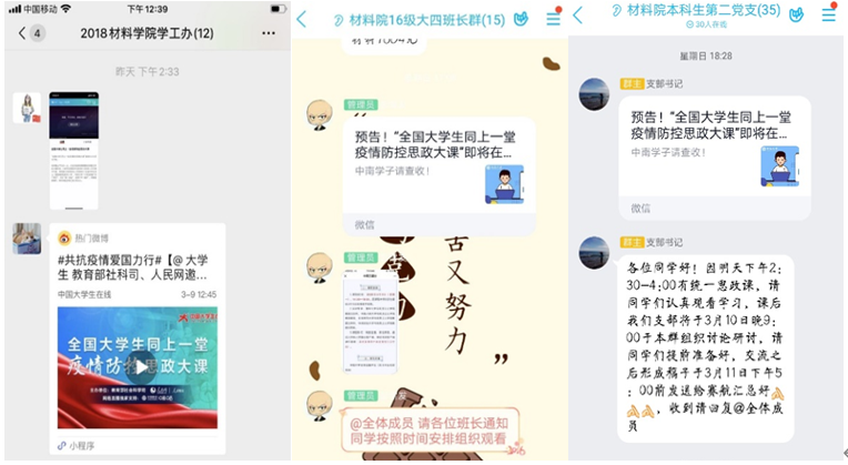 众师生对此次思政大课反响热烈。材料院党委副书记胡小清说:在这个非常时期,给全国大学生来这么一堂思政大课太有必要和很有意义!一代人有一代人的新长征,一代人也有一代人的责任与担当,“过去是你,现在是我”,体现的不仅仅是时代的变迁与新生代的成长,更是中国生生不息的生命力以及中华儿女的自强不息。材料院博士生、研究生、本科生们都坚信,在这次“战疫”中,全国人民在中国共产党的领导下团结一心共同抗争,必将很快取得全面胜利。