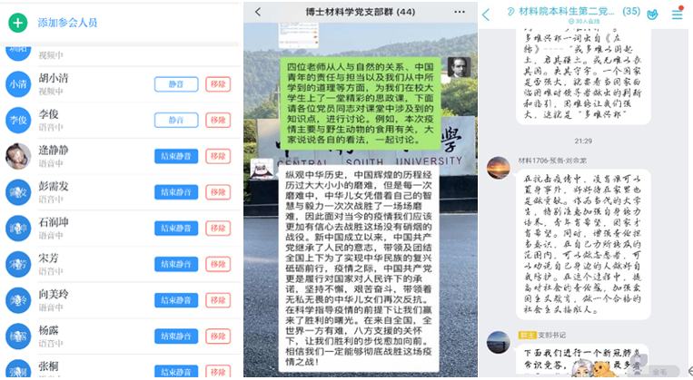 课程结束后,材料学院及时组织开展了线上交流研讨学习。除学生在各自班级内进行讨论交流外,全体学生工作干部也在胡小清副书记的指导下召开会议,围绕思政大课进行了感想分享与工作部署。各组织采用多种方式使线上讨论气氛高度活跃,比如本科生第二党支部就采取了线上问答的方式来检验此次学习的效果。