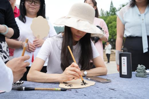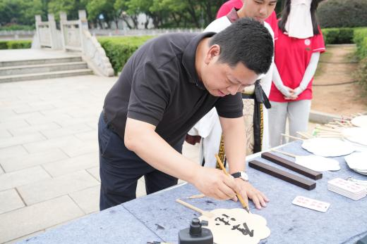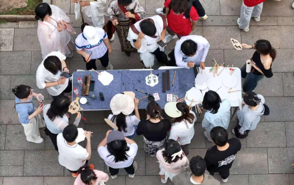 现场特别设置传统文化体验区,师生们在汉服志愿者的指导下,执笔书写祝福团扇,佩戴五彩绳结,缝制艾草香囊。22级本科生魏帅杰轻摇自制团扇感慨:“在扇面上挥毫的仪式感,让我触摸到了典籍里的人文记忆。”
