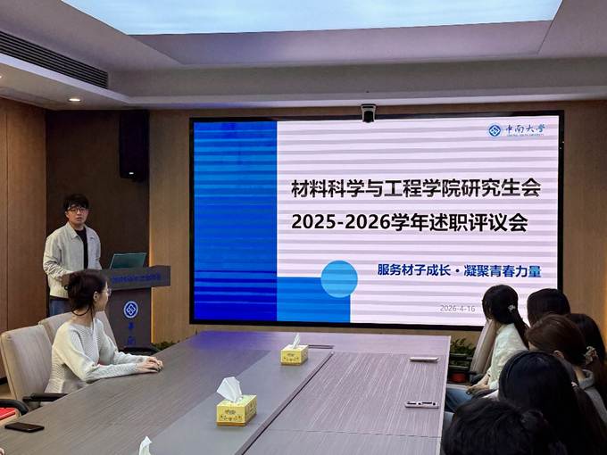 为深入学习贯彻习近平总书记关于青年工作的重要论述,严格落实《关于巩固高校学生会(研究生会)改革成果的若干措施》《关于高校学生会(研究生会)述职评议会的工作指引(试行)》等相关文件要求,为系统梳理本学期工作、检验研会骨干履职成效、锤炼高素质服务队伍、促进工作经验交流,2026年4月16日下午14:30,中南大学材料科学与工程学院研究生会2025-2026学年述职评议会在特冶楼229会议室成功举行。