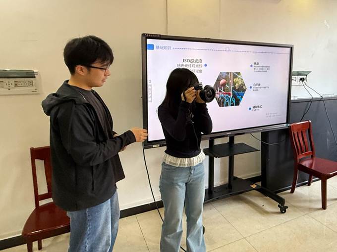为让培训内容更具实操性,罗逸豪结合校园宣传常见场景,重点讲解新闻摄影拍摄注意事项。他针对会议讲座、文艺活动、调研实践等高频场景,逐一拆解拍摄要点:强调会议拍摄需保证画面横平竖直,清晰呈现主讲人与PPT内容;活动拍摄需合理调节快门速度,定格动态瞬间;合影拍摄需控制光圈范围,确保全员面部清晰。培训中,他还结合校园实拍案例与反面素材,提醒参训成员规避画面歪斜、人物裁切不当、色彩失真等常见问题,让培训内容更具指导性。