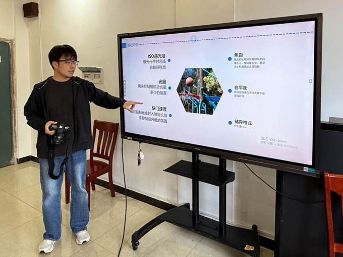 培训现场,罗逸豪围绕“基础知识、拍摄注意事项、后期处理”三大核心模块展开系统讲解,为参训成员搭建起清晰的摄影知识框架。在基础知识讲解环节,他聚焦曝光三要素——ISO感光度、光圈、快门速度,结合屏幕上的直观图示,逐一拆解各参数的功能与调节逻辑;同时详解焦距、白平衡、储存格式等关键设置,用通俗的语言阐释摄影基础原理,帮助参训成员快速理解相机操作核心,为后续实操奠定理论基础。