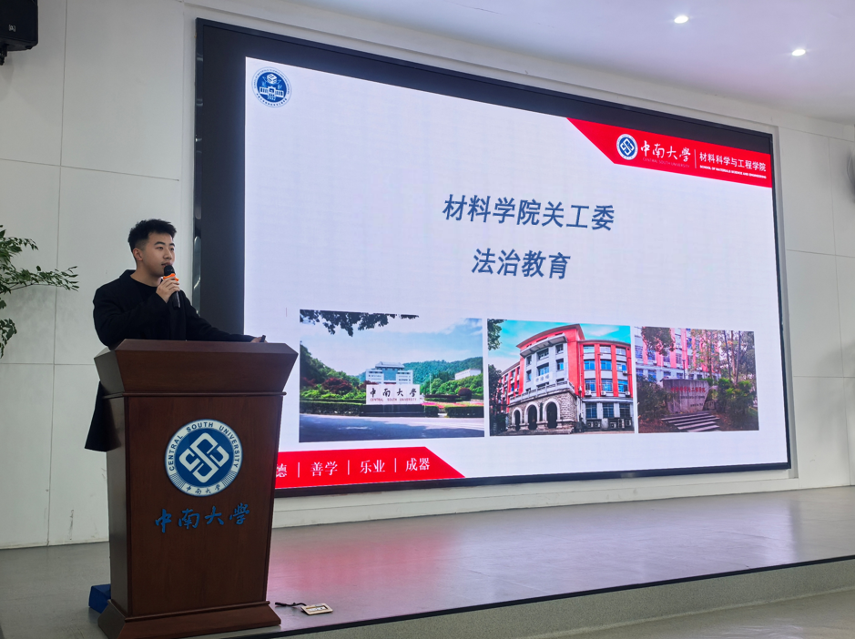 2025年6月6日下午,中南大学材料科学与工程学院关心下一代工作委员会在立言厅为2025级全体新生举办了一场题为“法治启航,守护青春”的法治宣讲会。本次宣讲会由学院关工委秘书陈少华老师主讲,旨在增强新生法治意识,引导其树立正确的权利与义务观念,为大学阶段健康成长奠定坚实基础。